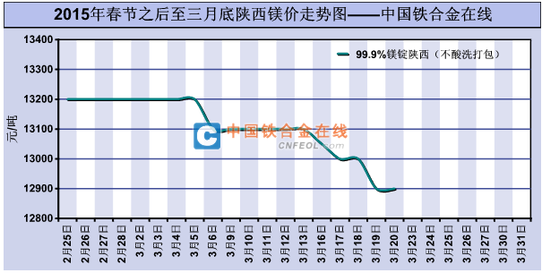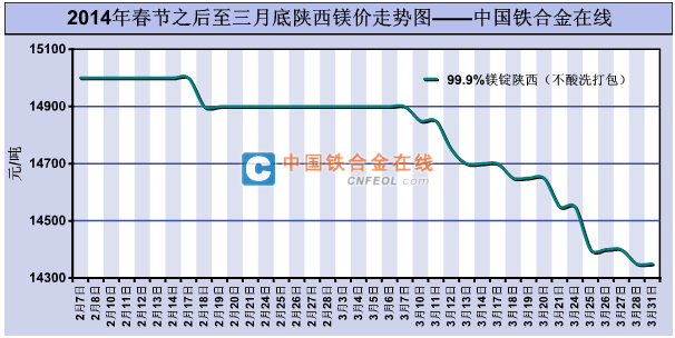 年前不上商家预测,由于春节期间镁厂并不歇息,年后势必会出现库存上升,压力增大,镁价下滑的景象。然年后第一周各家出货迅速,似乎告诉人们你们错了,新年新气象已经到来。但憧憬仅仅维持一个月,从那之后,市场开始朝年前预测的方向发展,最终形成库存增加,压力增大,镁价下滑的现状。据统计,从年后至今,镁价下滑已有400元/吨之多。